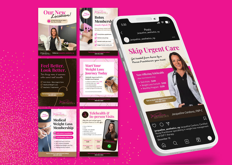 For Jacqueline Aesthetics, I developed a full brand identity built around femininity, warmth, and modern medicine. The signature palette of hot pink, soft blush, warm gold, and grounding beige and black strikes the perfect balance between approachable and elevated — feminine enough to resonate with women, yet refined and neutral enough to welcome male clients as well. A flowing script logo, delicate line-art facial illustration, and watercolor-inspired backgrounds work together to create a boutique aesthetic that sets the clinic apart from traditional medical practices. Carried consistently across the website, social media graphics, and print collateral, the brand positions Jacqueline Aesthetics as a welcoming destination where all clients feel confident, cared for, and excited to invest in themselves. I also designed and built her website — check it out at www.jacquelineaesthetics.com!
